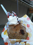 目の部分の黒目に見えるような部分は、焼く際に入ってしまった気泡のようなのですが、これのせいで白目を剥いているように見えてグロさがさらにUP! ちなみに普通においしいです。えらの少し下のあたりまで生クリームやコーンフレークが入っていて、下半身には普通のたい焼きと同じようにカスタードクリームが入っていました。一度で二度おいしい。